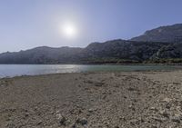 This stock photo shows a beautiful sunny landscape in Mallorca, Balearic Islands, Spain. The image features a stunning view of the coastal shore, with clear sky and sunshine reflecting on the surface of the sea. The natural environment is composed of mountains, open spaces, and wilderness, with a lake and beach in the foreground. The highland area is covered with water resources, gravel, and dirt, creating a picturesque scenery. It's a perfect depiction of the natural beauty and tranquility of Mallorca, a popular tourist destination in Europe.