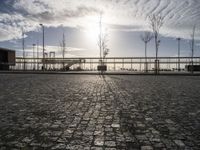 In picturesque Lisbon, Portugal, the early morning sun illuminates a cobblestone road, with modern architecture in the background. Benches invite passersby to enjoy the sunny atmosphere. A perfect day for exploring the city.