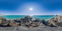the view of a beach through a fish eye lens lens on the rocks next to the ocean