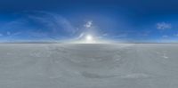 The salt flats stretch endlessly under a sunny sky, creating an open space defined by clouds and visible sun. This desert landscape offers a picturesque view of a salt lake, embodying natural tranquility.