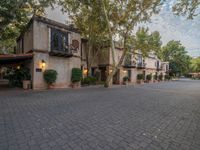 the building is next to a parking lot with benches on the side of it and trees lining the walkway