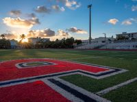 This image captures the beauty of dawn in Miami Beach, Florida. The sun is visible as it sets behind the letters of the school on the field, with the sports stadium in the background. The clear sky and sunny weather create a vibrant atmosphere. The greenery of the field adds to the picturesque scene, showcasing the importance of agriculture and the sport of football in the region. This photo represents a sunny and vibrant day in Miami Beach, Florida.