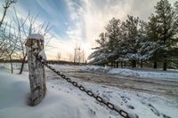 there is snow on the ground and some trees near the road in winter time with chains in front of it