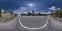Sunny day in Colorado's suburban landscape. Gravel and dirt surface roads curve through open spaces. Rock and asphalt mix under hard shadows. Nature meets residential areas with visible sun and clear blue skies.