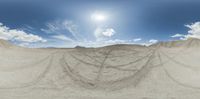 Utah landscape featuring a river cutting through desert terrain. Sun visible in the cloudless sky illuminating the open space. Gravel and dirt areas contrast with greenery and rocky surfaces.