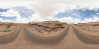 A sunny day in Utah, USA. The open landscape showcases winding road curves on gravel and dirt surfaces. The sun visible in the clear sky casts a warm glow over the greenery and grass surfaces.
