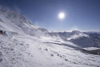 This stock photo showcases a breathtaking winter landscape in France, Europe. The image captures a sunlit mountain range with snow-covered slopes, providing a stunning view of the natural mountain landforms. The clear sky and sunshine enhance the picturesque scenery, making it a popular tourist attraction for winter tourism. The photo displays the beauty of the Alps, giving an overview of the glacial massif and Piste surface. The sun visible in the image adds warmth to the winter scenery, making it a perfect depiction of the region's charm and tourism potential.