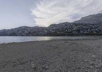 A breathtaking view of the sunrise over the coastal landscape of Mallorca, Spain. The clear sky reflects on the calm waters of the sea, creating a serene and peaceful atmosphere. The mountains in the background add depth to the scene.