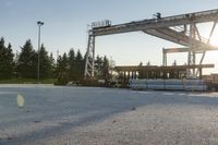 This stock photo features a stunning sunrise over the city of Toronto, Ontario, Canada. The photo showcases a bridge and road with low concrete and asphalt surfaces. The cityscape includes buildings, houses, open spaces, and a beautiful landscape with trees. The image captures the city's infrastructure, such as factories, steel structures, and road surfaces with lanes. The sunlight casts shadows and illuminates the vehicles and construction equipment in the scene. The photo also includes elements of nature, like soil, metal beams, and a stadium. The land lot is visible, along with a park and thoroughfare. A crane can be seen in the distance. The sky is clear and sunny, with the sun visible as it rises above the city.
