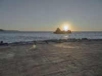 This breathtaking stock photo shows the sun setting over a rocky outcropping in the ocean at low tide in Portugal. The serene coastal landscape, with clear skies and the afterglow of the sun, creates a picturesque scene. The golden sunlight reflects beautifully on the water's surface, adding a touch of magic to the image. The open space and concrete-like texture of the rocks enhance the natural beauty of the European coastline. With its sunny atmosphere and tranquil vibes, this photo captures the essence of a peaceful beach getaway. Perfect for showcasing the stunning natural beauty of Portugal and the calming power of nature.