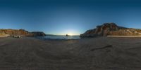 three motorcycles are parked on the beach near the water and cliffs at sunset time in a fish eye photo
