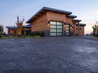 Sunset view of a spacious wooden home with garage entrance