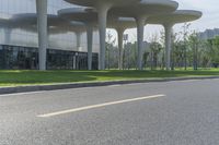 A motorcycle rider zooms past a futuristic office building in Suzhou's bustling business district. The modern architecture and tall structures create a dynamic urban landscape against a clear sky. The city's urban design and infrastructure make it a hub of activity and innovation.