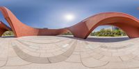A unique sculpture in Suzhou, China, designed with a fish-eye view. The modern architecture and artistic design create a futuristic atmosphere against a clear sky. A captivating piece in the cityscape.