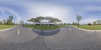 A modern skate park in Suzhou, China, with futuristic architecture and a clear sky. The panoramic view captures the vibrant city life and the unique design of the park. Umbrellas provide shade for spectators.