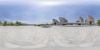 the park is empty and has many stone benches in it with geometric circular designs on its surface