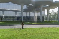 a fire hydrant is outside of an office building with many columns above it and grass in front
