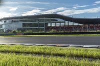 A car races down a paved road through the grassy landscape of Suzhou. The modern architecture of a stadium looms in the background, illuminated by the sun. A perfect day for a race.