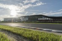 This image captures a sunny day at a race track in Suzhou. The modern architecture of the stadium stands out against the rural backdrop of grass and fields. The race track, with its smooth asphalt surface, is the centerpiece of the infrastructure. Spectators can be seen enjoying the sport in the stadium stands. The sun is shining brightly, casting a warm light over the land lot. This photo depicts a perfect racing environment with clear skies and ideal weather conditions in Suzhou.