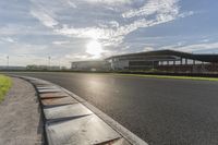 A modern architecture race track and stadium in Suzhou, China. The low dawn light casts long shadows on the grassy land lot. The urban infrastructure creates a perfect setting for a sunny day race.