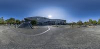 A sunny day in Taichung City, Taiwan, showcasing the modern and urban design of a library building. The clear sky casts hard shadows on the empty parking lot and gravel surface, creating a straight road leading to the building.