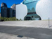 This image captures the modern architecture and urban design of Taichung City, Taiwan. In the foreground, a person is skateboarding on the asphalt road, with a clear sky overhead. The focus of the photo is a building with a unique green apple-shaped design, showcasing the innovative and artistic atmosphere of the city. The cityscape displays a mix of traditional and modern architecture, reflecting the rich cultural heritage of Taiwan. This photo represents a typical day in Taichung City, where urban life thrives alongside captivating architectural landmarks.