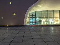 A nighttime view of a modern theater in Taichung, Taiwan. The sleek profile of the architecture stands out against the dark sky. Artificial lights illuminate the open plaza, creating a stunning display of modern architectural design.