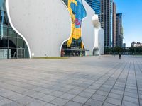 A sunny day in Taichung, Taiwan. A man walks along the expansive walkway, surrounded by modern architecture and clear skies. The large building with art on its facade adds a touch of urban design to the city.
