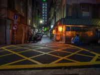 This image captures a dark city street with a bicycle parking space on the sidewalk in front of a shop front. The urban landscape showcases the city life of Taipei 101, with its classic architecture and artificial neon lights illuminating the road. The road surface, made of asphalt, provides a smooth path for vehicles and tires. The straight road leads to a crosswalk and suburban residential areas. This photo represents the vibrant urban design and nightlife of Taipei. It is an excellent representation of cityscape and urban infrastructure in Taiwan.