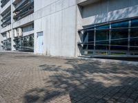 This image captures the vibrant business district of Taipei, Taiwan. The clear blue sky casts hard shadows on the empty road, creating a striking contrast against the glass windows of the office buildings. The trees add a touch of green to the urban landscape. This photo represents a typical sunny day in the Republic of China's capital, showcasing the bustling energy of the business hub. The image reflects the modern and progressive nature of Taiwan's business infrastructure.