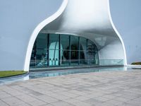 A modern architectural marvel in Taiwan. The white curved structure seamlessly integrates with a pool, providing breathtaking views through large windows. The lush greenery surrounding the design adds a touch of nature to the urban landscape.