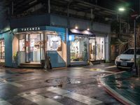 This image captures the vibrant city life in Taipei, Taiwan. A wet street reflects the neon lights of the city, creating a captivating urban scene. In the foreground, a store stands at the corner, with a car passing by. The artificial light, street lights, and neon signs illuminate the rainy night, giving the city a unique atmosphere. This photo showcases the urban design and bustling energy of Taipei City, known for its modern infrastructure and lively streets.