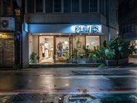 a store in the rain on the side of the street by the building with a blue sign saying, ohcher store