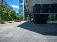 A view of Taipei City, Taiwan, showcasing its modern architecture and urban design. Two skyscrapers rise in the background while another building stands in the foreground. Clear skies and hard shadows enhance the city's futuristic appeal.
