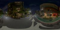a 3d vision view of some buildings at night with arrows and buildings across the road
