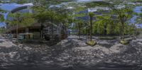 A 360-degree panorama on the ground in Taipei, Taiwan. The view showcases modern architecture, urban design, and city life. Trees and buildings create a vibrant cityscape. Enjoy the outdoor seating at a cafe while taking in the sights.