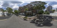 a photo of a building, trees, and a paved street with one motorcycle parked on the curb
