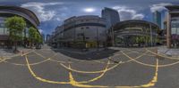 a panoramic view of the city street taken in a fisheye mirror with a sky background