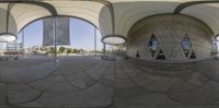 Urban design in Kaohsuing, Taiwan. Two big balls on the ground reflect the surrounding city life. The glass wall of the art center casts a hard shadow on the concrete surface. A modern and artistic day in Taipei.