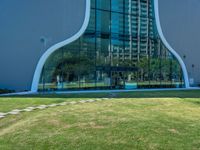 a green lawn in front of a building with an abstract shape on it and stairs to the side of it
