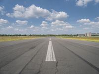 A view from the open space of Tempelhof Airport in Berlin, Germany. The straight road stretches into the horizon, surrounded by fields and nature. Clear skies and cumulus clouds create a scenic landscape.