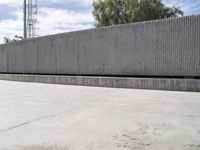 In the heart of Tenerife's business district, a modern concrete office building stands tall next to a large cement block wall. The clear sky and open space reflect the vibrancy of city life in this urban design masterpiece.