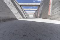This image showcases a modern architecture project in Spain, specifically in Tenerife, Europe. The photograph captures an under construction walkway made of concrete, with red windows and bars above it. The straight road creates a strong visual line, leading the viewer's gaze to the futuristic architecture. The clear sky serves as a backdrop, creating a contrast with the construction site. This photo highlights the innovative infrastructure and architectural designs found in Spain, particularly in Tenerife. It portrays the blend of straight lines, low surfaces, and modern elements that define this European destination.