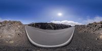 A scenic view of a curved road in Tenerife, Spain, surrounded by rocky mountain slopes. The road leads to a clear blue sky, creating a sense of vastness and adventure in the rugged European landscape.