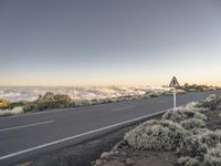 A scenic mountain road in Tenerife, Spain, surrounded by clouds and trees. The asphalt surface glimmers in the dawn light, leading to a clear, blue sky. An enchanting break of day in Europe.