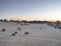 a lone horse is laying in a rocky area near rocks and boulders as the sun goes down