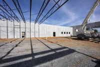 A construction site in Johnson City, Tennessee. The building stands out against the clear blue sky. Tools and equipment are scattered on the concrete surface, surrounded by rugged terrain. A busy day for construction work in Tennessee.