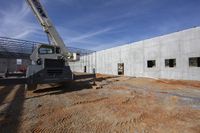 Construction site in Johnson City, Tennessee. A large crane stands next to a rugged warehouse under construction. Open space and dirt surface surround the site. Concrete, gravel, and contrails from passing vehicles indicate progress.