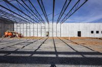 the interior of a large industrial warehouse under construction on a clear day with construction workers surrounding