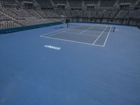 two tennis players are playing on the court at a tennis stadium that has blue and white colors